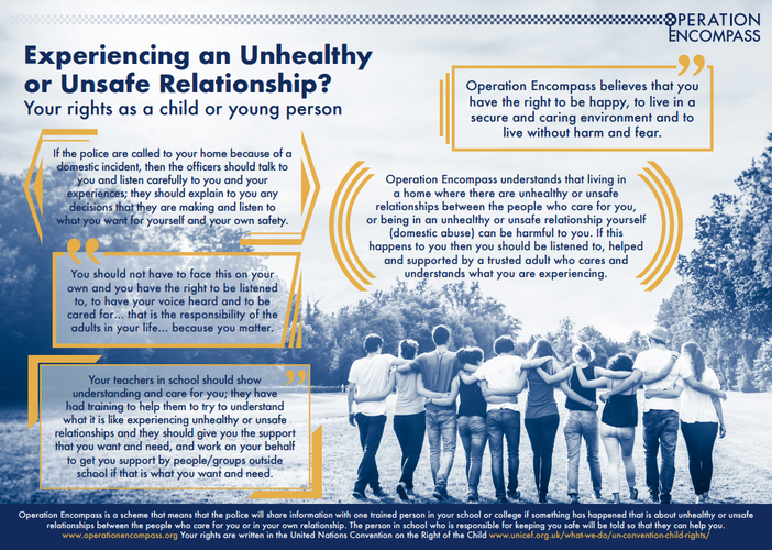 Operation Encompass is our way or working directly with the police to support families where there are members who are victims of domestic abuse. We hope the information and guidance on this page helps. However, please always get in touch with us, or one of the agencies below, if you would like to talk.